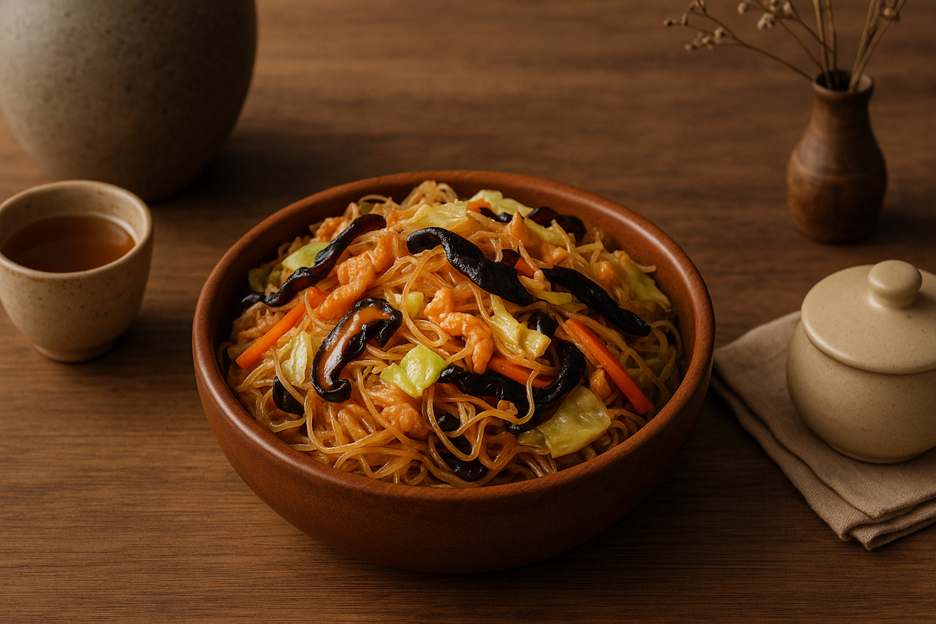 Thin rice noodles stir-fried with savory toppings and