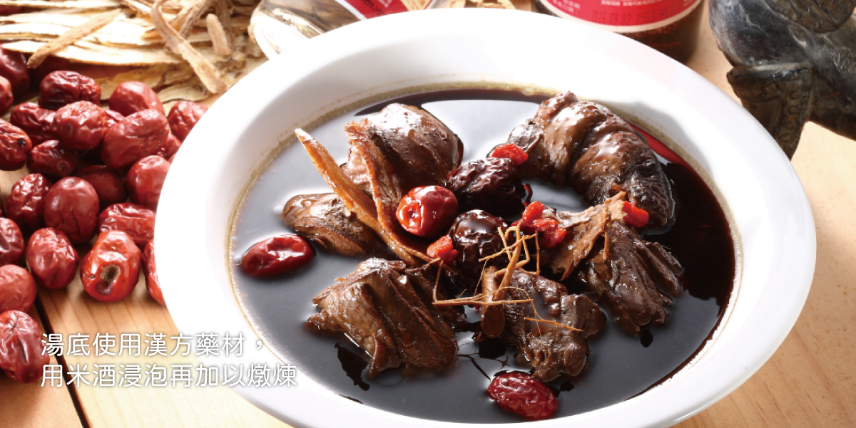內容物:藥膳湯(水、米酒、黃耆、川芎、枸杞、小茴、桂枝、當 歸、熟地、紅棗、黑棗、九尾草)、仿土雞(全腿)、米酒