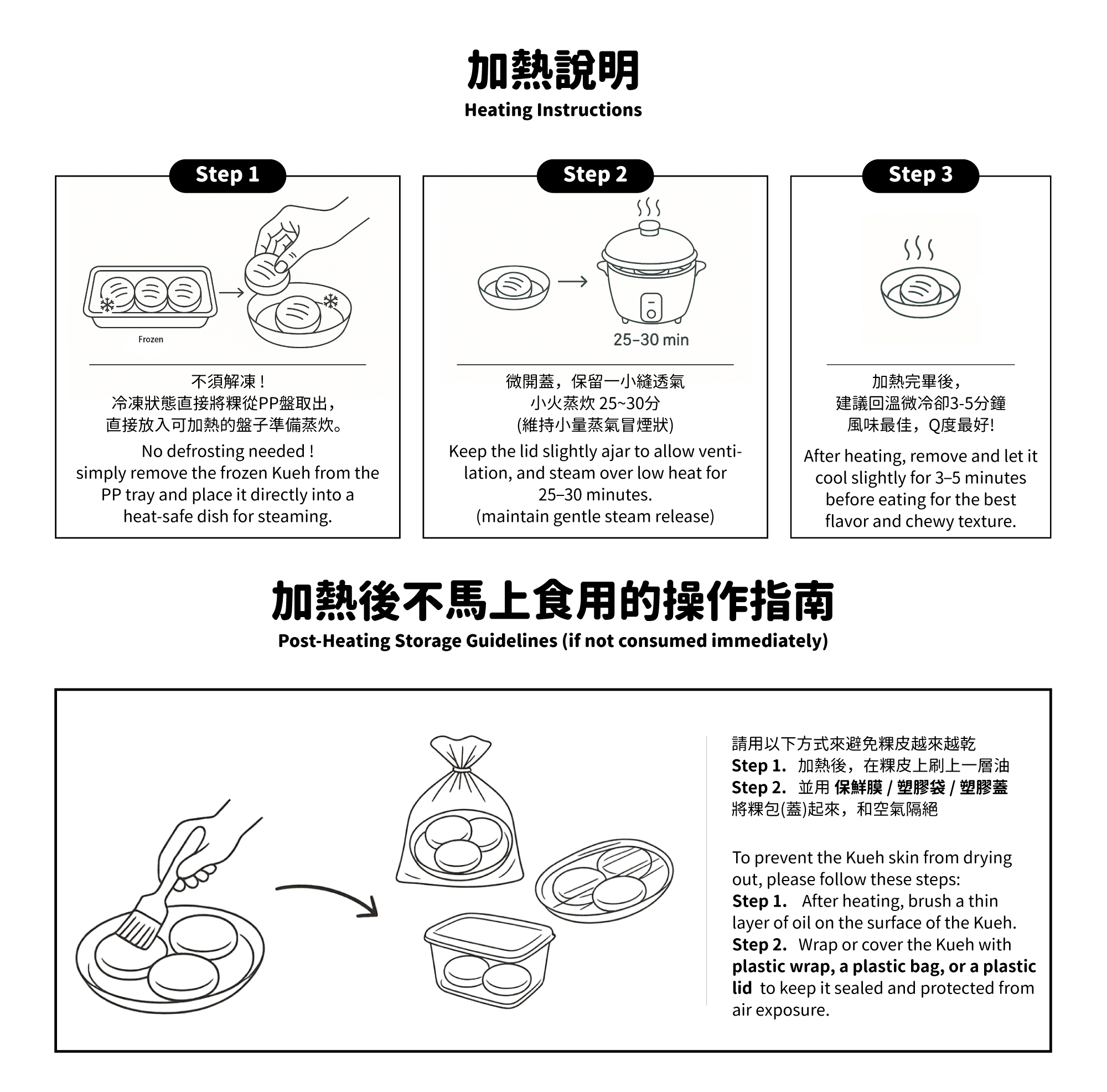 Preparation Instructions:Remove the bag. Thawing the product and steam for 25~30mins and serve. (After the heating is completed, let it cool slightly before eating, so that the skin of the kueh will become chewy and irresistible.)
