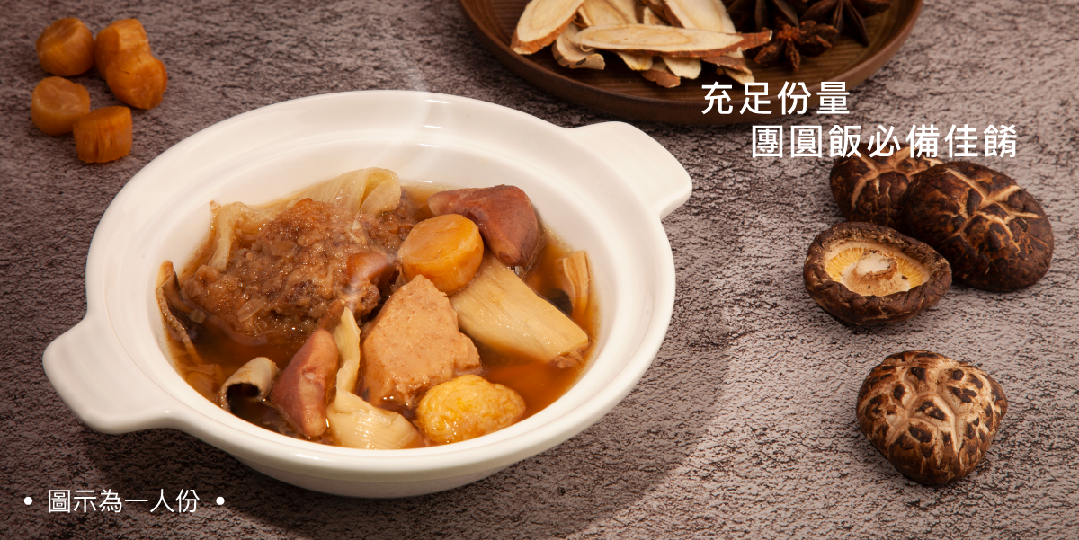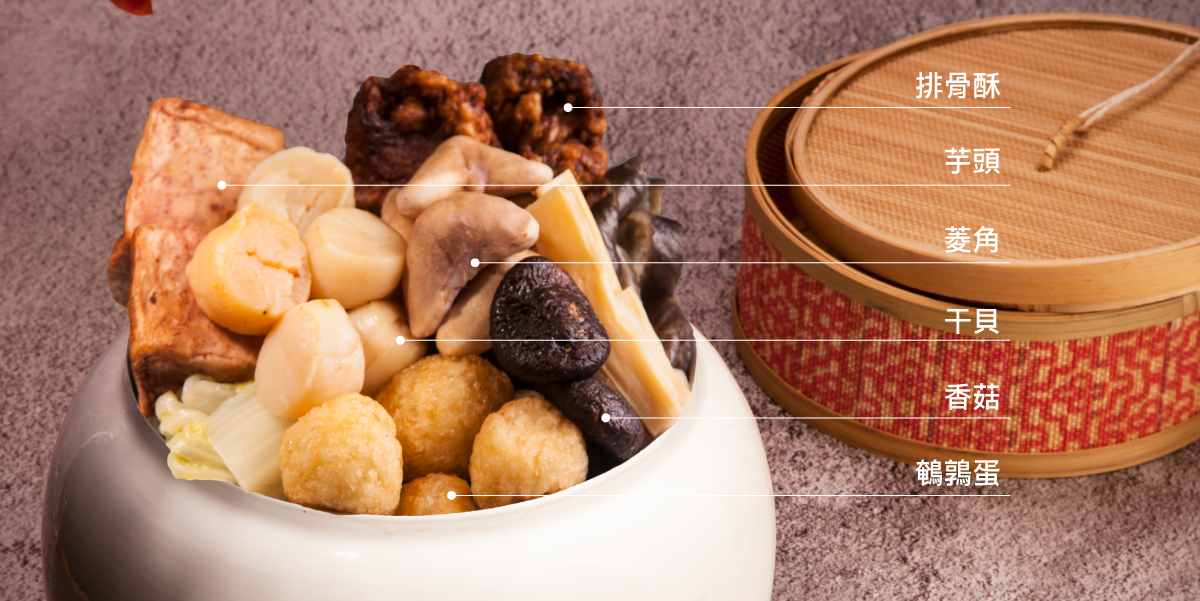 內容物:水、大白菜、筍干絲、鯊魚皮、干貝、菱角、排骨酥、芋頭角、香菇、鵪鶉蛋、蝦酥、蒜酥