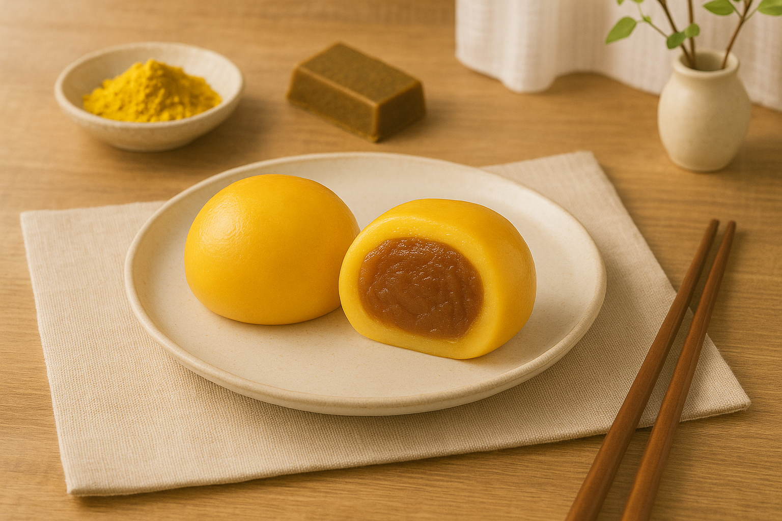 以薑黃粉與糯米粉手作粿皮,帶出金黃自然色澤與溫潤香氣,